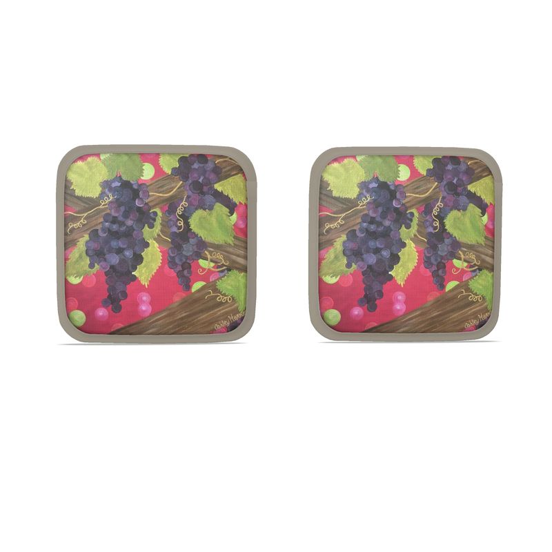 Celebrate the harvest season all year round, with this bright pair of grape vine pot holders. The original artwork brings bright abundance into your kitchen.